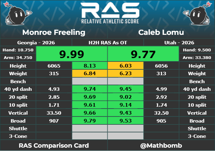 I also found it interesting that the other OL1 candidate — Spencer Fano — compares strongly athletically to Dillon Radunz and Jaelyln Duncan, who both busted during Ossenfort’s time in Tennessee.