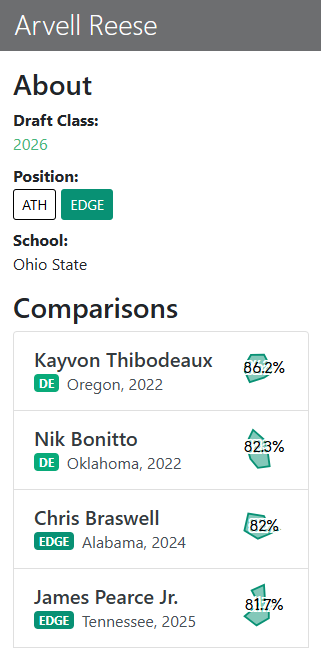 The experts have this as a three-way race between Reese, Sonny Styles, and David Bailey, but the overarching drumbeat has been Reese. This would be a pick that fits with GM Darren Mougey’s history. He was the assistant GM in Denver when the Broncos drafted Nik Bonitto — who just so happens to be the second-most athletically comparable player to Reese according to Mockdraftable.